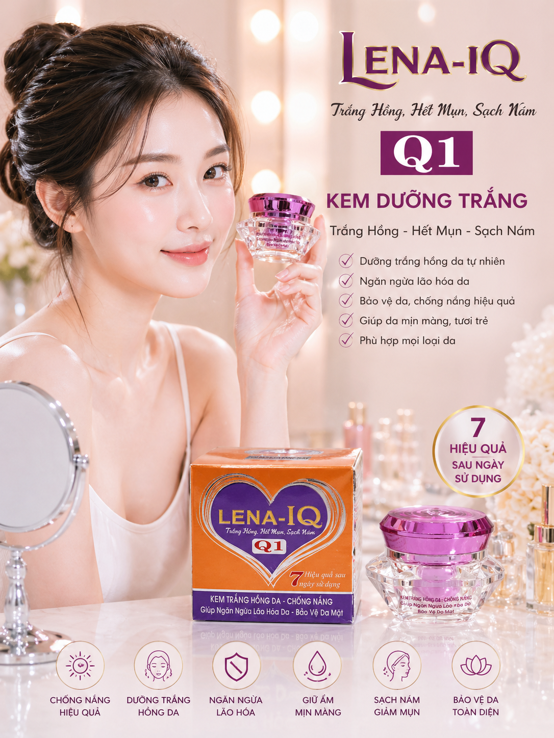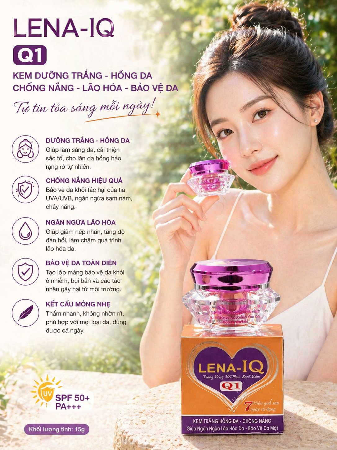 Kem dưỡng trắng - Hồng da - Chống nắng - Lão hóa - Bảo vệ da LENA-IQ Q1 (20g) có tác dụng làm trắng da, tái tạo bề mặt, cung cấp độ ẩm, làm giảm sắc tố đen, ngăn lão hóa, chống nắng, bảo vệ da tác động của môi trường. Đặc biệt có thể dùng kem trang điểm hàng ngày.