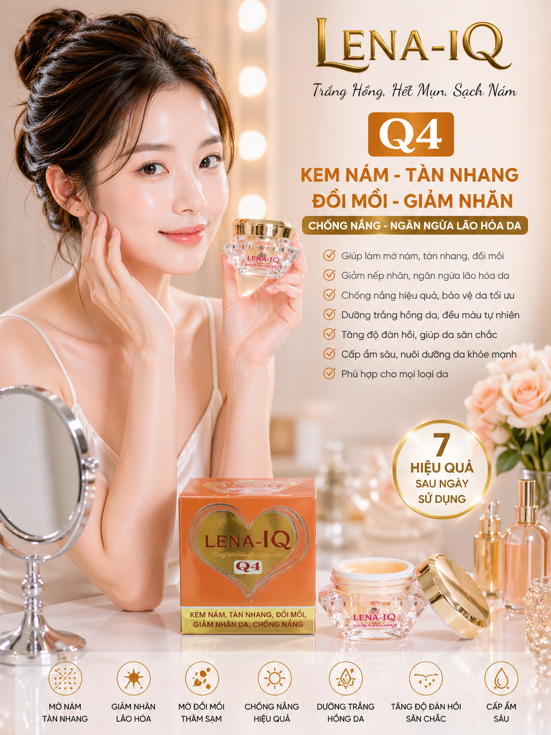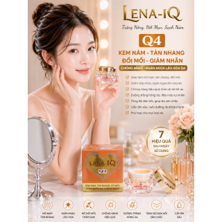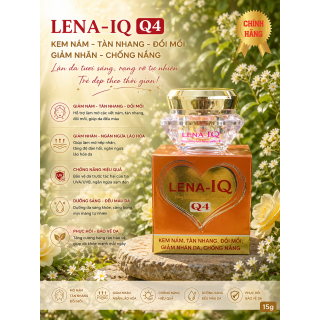 Kem nám - Tàn nhang - Đồi mồi - Giảm nhăn - Chống nắng - Ngăn ngừa lão hóa da LENA-IQ Q4 (20g) có tác dụng làm mờ các vết nám, sạm, tàn nhang, đồi mồi, ức chế hình thành sắc tố đen, giúp da đều màu, trắng mịn, dưỡng ẩm, ngăn ngừa lão hóa, làm giảm vết nhăn, giúp da luôn trẻ đẹp, chống nắng, bảo vệ da khỏi tác động của môi trường. Đặc biệt có thể dùng làm kem trang điểm hằng ngày.