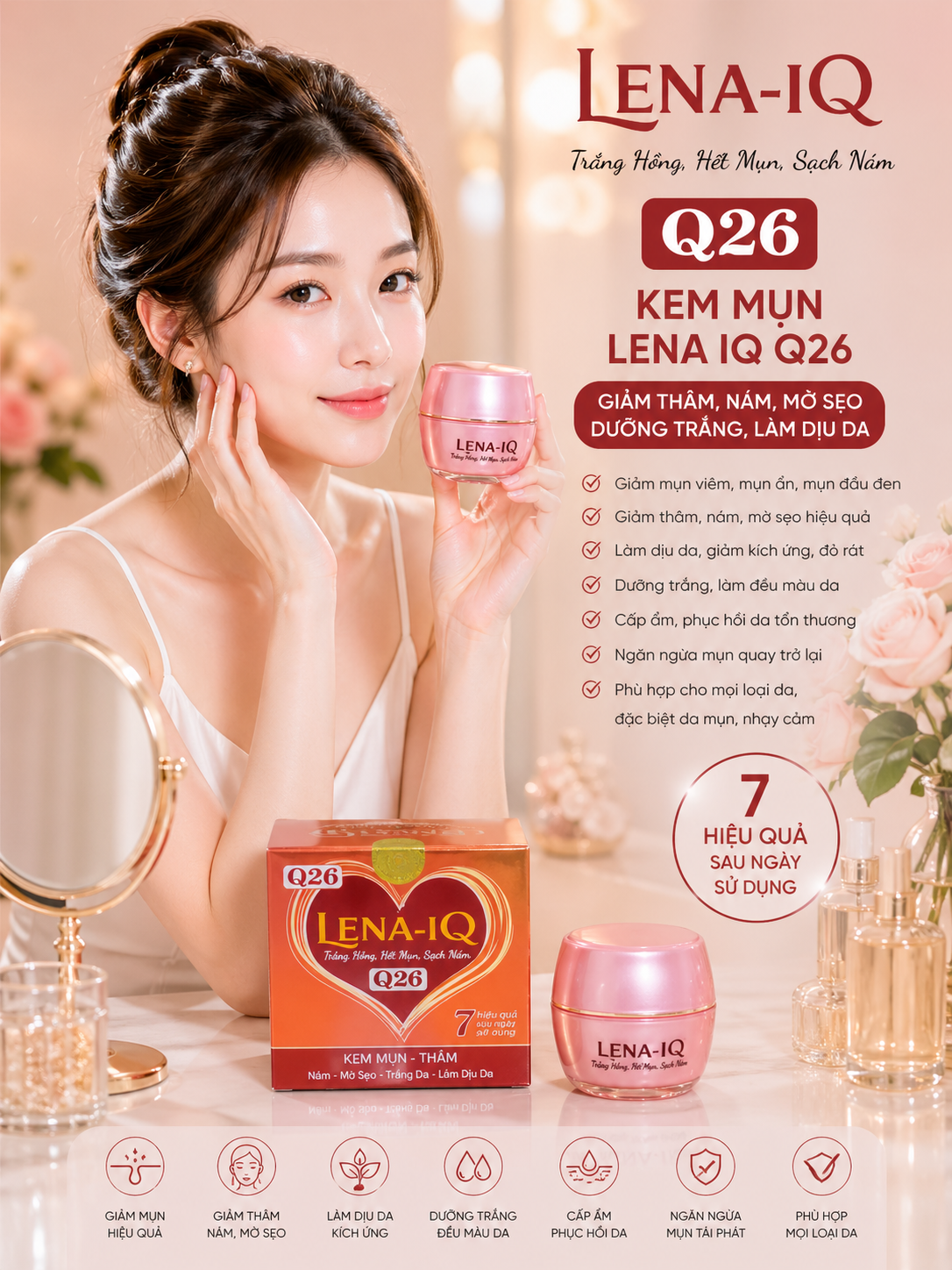 Kem mụn LENA IQ Q26 giúp làm giảm mụn, mờ thâm, mờ sẹo, làm mờ vết nám, đem đến cho bạn làn da trắng mịn thuần khiết và bền lâu. Có thể dùng làm kem trang điểm hằng ngày. Đặc biệt không ăn nắng.