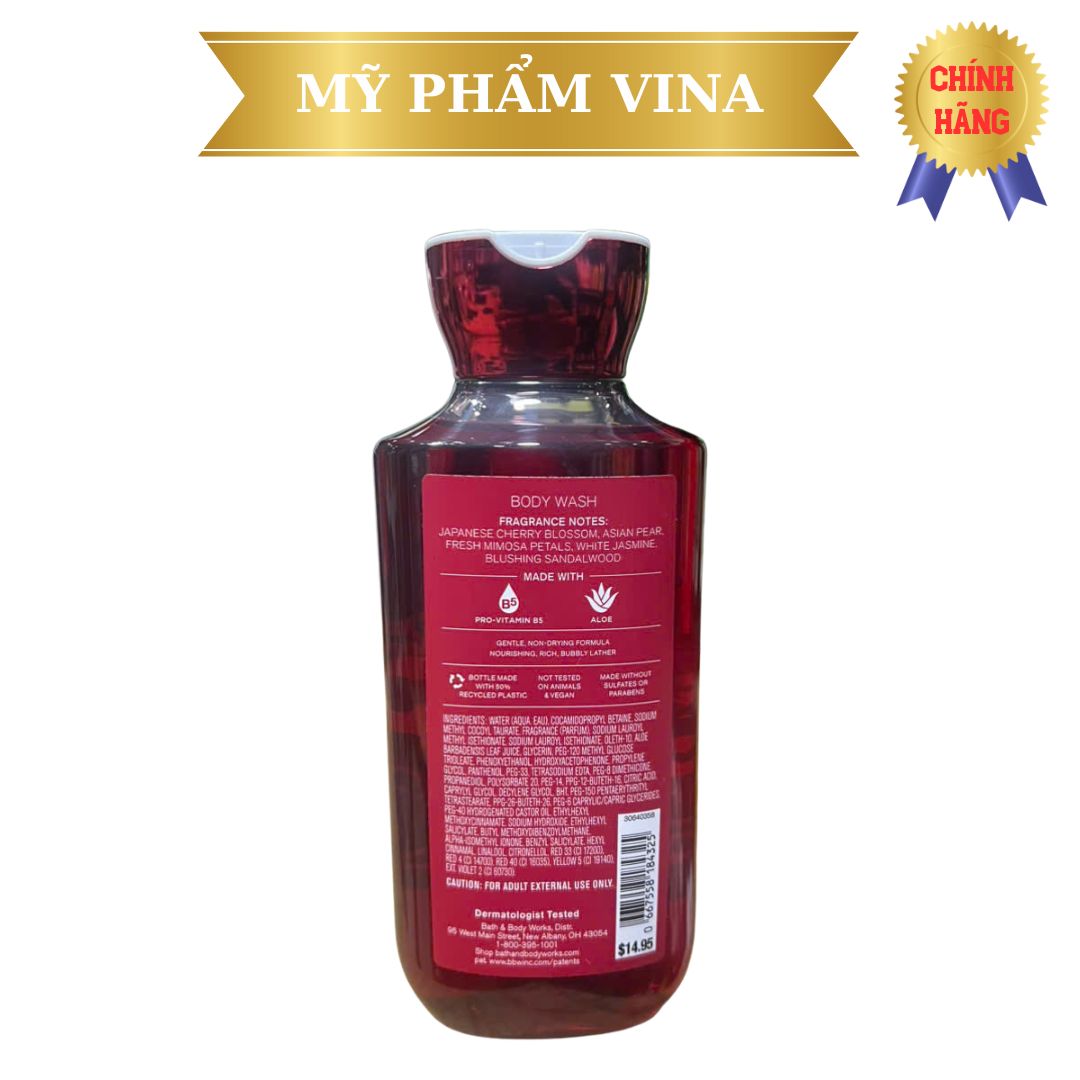 - Sữa Tắm - Japanese Cherry Blossom - Bath & Body Works Shower Gel được chiết xuất từ các loài hoa và vitamin thiên nhiên, cung cấp ẩm và dưỡng chất giúp da mềm mịn, đồng thời tăng cường sức sống cho làn da căng mượt, trẻ trung, làm chậm quá trình lão hóa da.